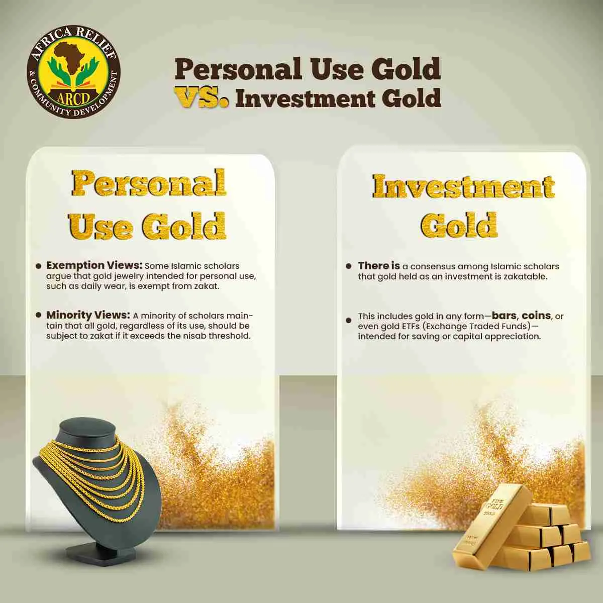 A key distinction in the calculation of zakat on gold lies between personal use gold, such as jewelry worn regularly, and gold held as an investment.